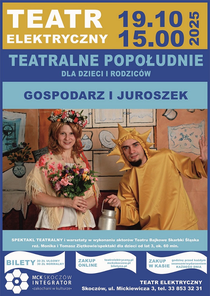 Miejskie Centrum Kultury "Integrator" zaprasza na kolejny spektakl w ramach cyklu Teatralne Popołudnie dla dzieci i rodziców do Teatru Elektrycznego w Skoczowie. Gospodarz i Juroszek